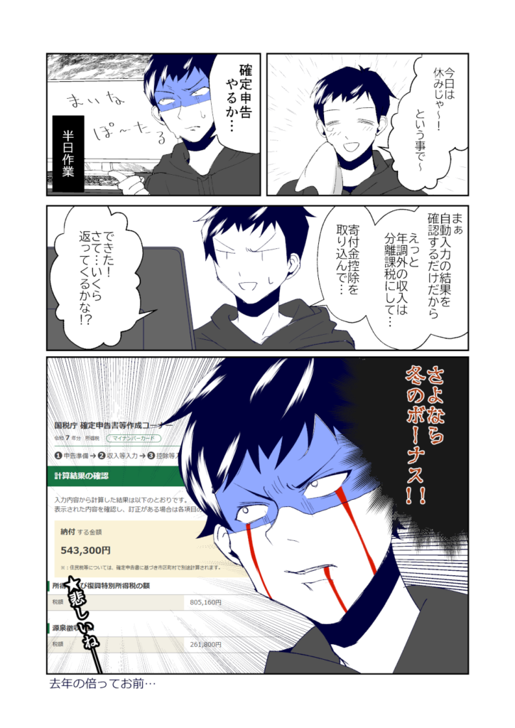 数値入力は無く、自動入力されたデータを確認して一部の収入を総合課税か分離課税かを選択して終了!簡単!